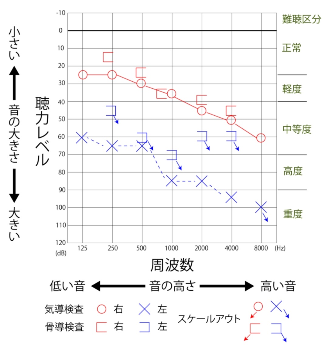 Rさんは左全体が下がっていて、小さい音域は「軽度」を通り越して「中等度」。
